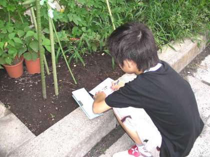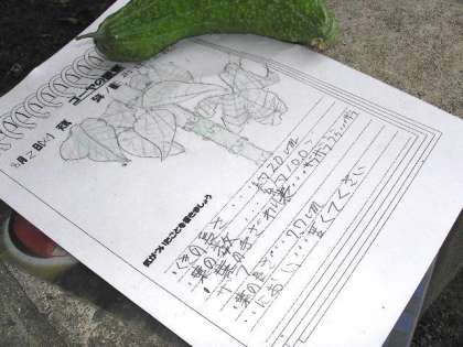 ゴーヤの観察カードを書いていました。葉の大きさや色、実の様子をスケッチしていました。(8月6日)