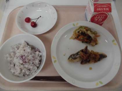 山形県産の「さくらんぼ」です。さくらんぼは旬の時期が短いので、給食でも年に1回しか出せません。貴重な旬の味、おいしくいただきました。
