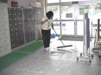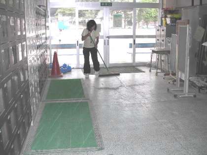 校庭へは、正門から来客用の昇降口を通っていくため、砂やほこりで汚れてしまいます。毎日、主事さんが掃除をしています。(8月11日)