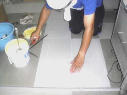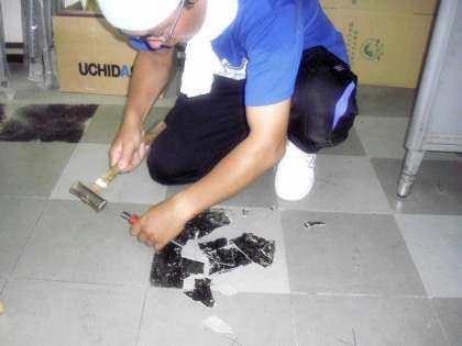 主事さんが、床のPタイルを補修しています。(8月13日)