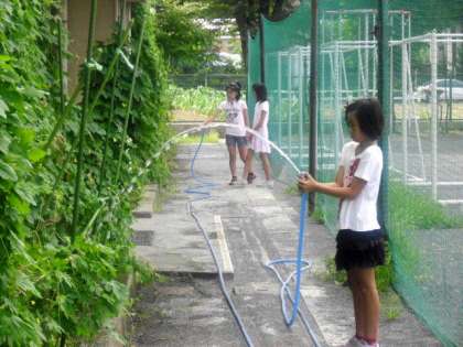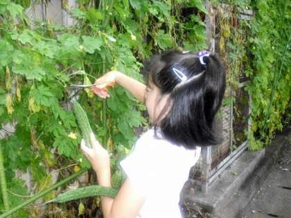 毎朝、水やり当番の子どもがゴーヤに水やりに来ています。実ったゴーヤを見つけて収穫していました。(8月13日)