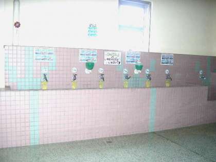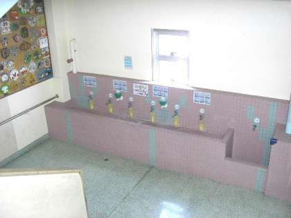 校舎内にある水飲み場の1つです。階段の途中にあり、休み時間が終わり教室に戻ってくる子どもたちが手洗いうがいをしています。(8月14日)