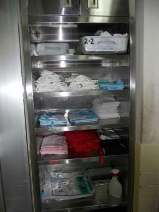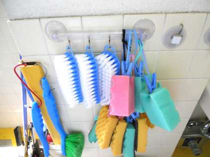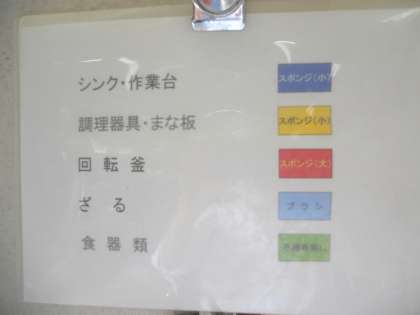 できあがったものを配食する際、エプロンを色わけして使っています。また、食中毒菌の二次汚染を防ぐために、洗浄する時のスポンジも色わけして使っています。(8月15日)