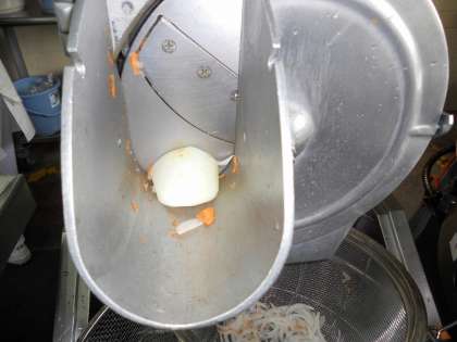 給食室より その5 公開日 2011/08/15 更新日 2011/08/15 その他の教育活動 野菜裁断機(スライサー)です。機械につける刃によって、せん切りやいちょう切り、みじん切りなど、いろいろな切り方ができます。(8月15日)