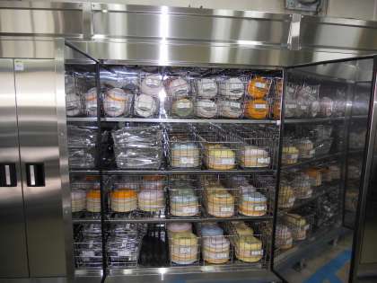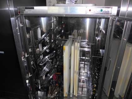 洗い終わった食器は、「熱風消毒保管庫」で85度まで加熱し消毒をします。包丁やまな板も、専用の「包丁まな板殺菌庫」にいれます。(8月16日)
