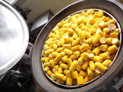 回転釜でとうもろこしを蒸しているところです。この日のとうもろこしが2年生が皮をむいてくれました。(8月17日)