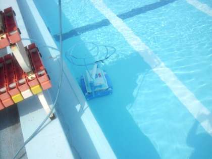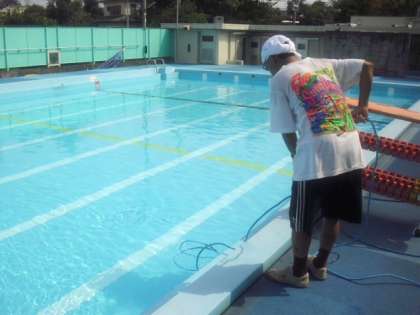 夏休み中、水泳指導がない日は日直の先生が水の管理をしています。(8月17日)