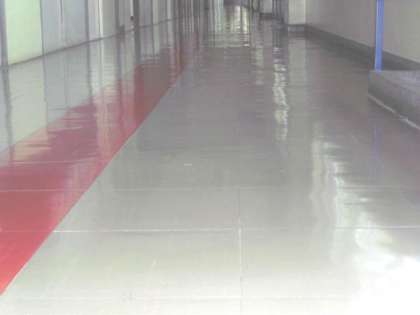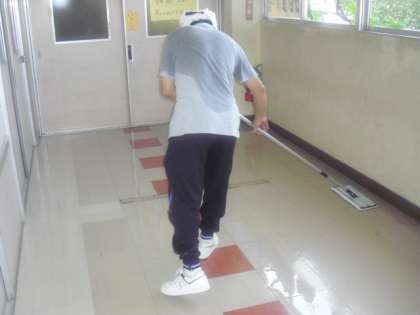 主事さんが、校舎内廊下にワックスかけをしています。(8月18日)