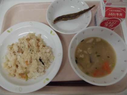 呉汁は全国各地に伝わる郷土料理のひとつです。水につけ、やわらかくした大豆をすりつぶしたものを「呉」といい、呉を入れたみそ汁なので「呉汁」と呼ばれるようになりました。給食では呉のほかにも、だいこん、さつまいも、鶏肉などを使い、栄養まんてんに作っています。