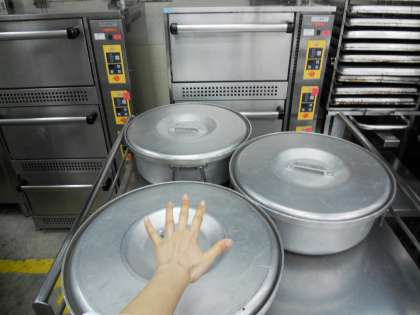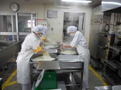 炊きあがったご飯はクラスごとに配缶します。いつも、全校分で55kgの米を炊いています。大きな炊飯釜8釜分です。(8月21日)