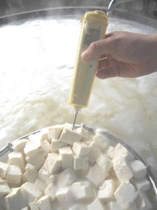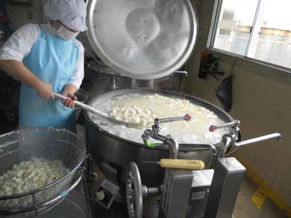 豆腐をゆでているところです。加熱する食材は、75度1分以上の温度確認をします。75度1分以上で加熱すると、O−157食中毒菌が死滅するからです。(8月22日)