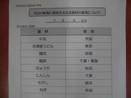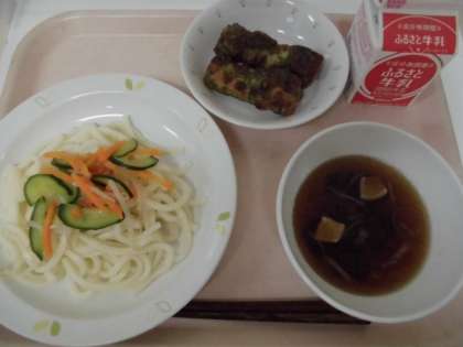 今日は夏にぴったり「冷やしうどん」でした。喜多見小のうどんは、つゆに鶏肉、わかめ、ねぎを、めんにはシャキシャキ野菜をのせ、具だくさんにしていただきます。食欲が少ない日でも食べやすいですね。