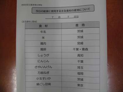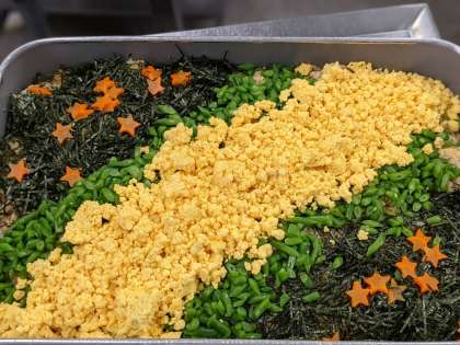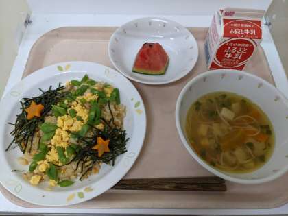 七夕献立です。そぼろごはんは炒り卵で天の川を作り、周りをさやいんげんの笹の葉、のりの夜空、にんじんのお星さまで飾りました。七夕汁には、天の川と短冊に見立てたそうめんとにんじん、さらに星型のおふも入っています。子どもたちからは食缶を開けた瞬間にわーっと歓声があがりました。