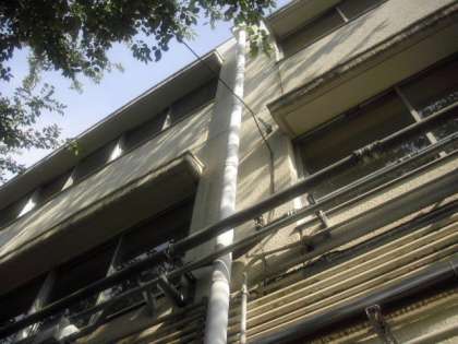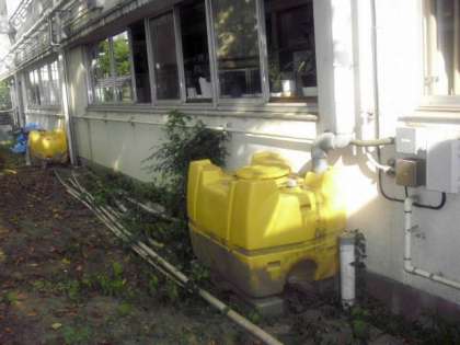 植物の水やり用に、主事さんが雨水タンクを設置しています。(8月29日)