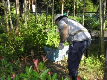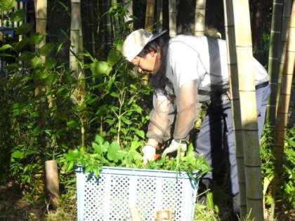 竹が育っている場所に雑草が生えてきたので、主事さんが朝早くから雑草とりをしていました。(8月30日)