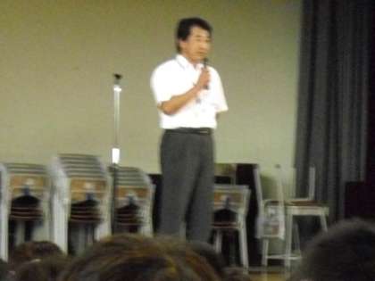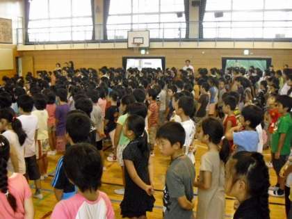 雨が降っていたので、児童朝会は体育館で行いました。(9月5日)
