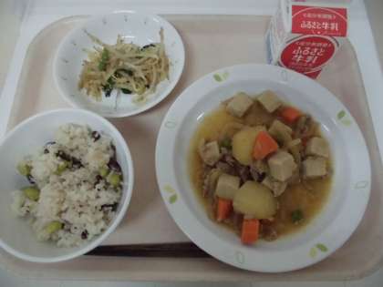 秋のはじめに咲く萩の花をイメージした「萩ごはん」。小豆は赤むらさき色の花を、枝豆は緑色の葉っぱをあらわしています。見て美しく、食べておいしい秋ですね。