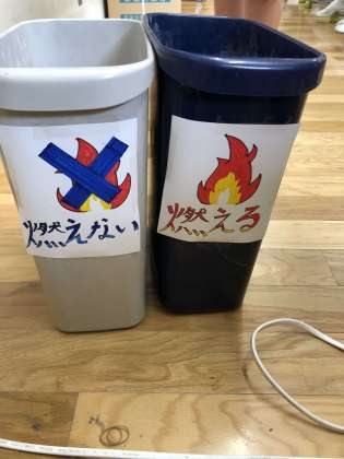 ゴミ箱は、色だけでは燃える・燃えないを間違えてしまう人がいるからという理由で掲示を作りました。