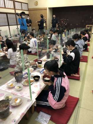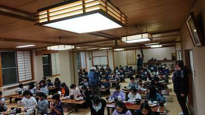 一日目の夕食の様子です。宿によってちょっとずつ違っています。豪華な食事に子どもたちには大満足!