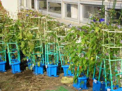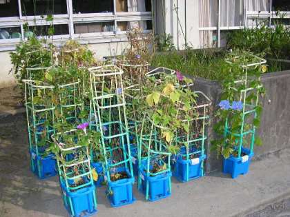 夏休み中、家で世話をしていたアサガオが、校庭にもどってきました。(9月15)