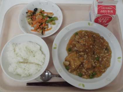 生揚げは別煮をしてからそぼろあんと合わせています。別煮をすると、余分な油っぽさが減り、味が染みておいしくなります。子どもたちは、ごはんの上にのせて食べていました。