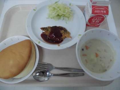 クラムチャウダーは、あさりが入ったクリームスープです。今日は他にも、しめじや野菜をたっぷり使い、具だくさんに作りました。あさりは苦手な人が多い食材ですが、チャウダーにすると食べやすかったようで、どのクラスもよく食べていました。