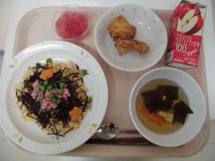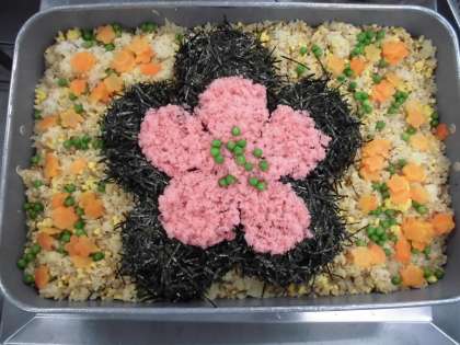 ちらしずしの食缶は、にんじんや桜でんぶ、刻みのりで校章の梅をかいています。紅白ゼリーは、ゆず風味の白色ゼリーとぶどう風味の赤色ゼリーの二色ゼリーです。今日は、委員会で作ったおたよりと飾りでワゴンも華やかになりました。
