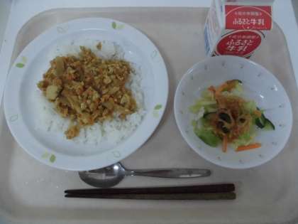 タコライスには、ごぼう、にんじんをはじめとする根菜をたっぷり使いました。しょうゆとみそが入っているので、和風の味付けになります。