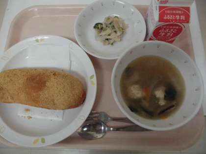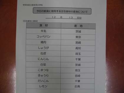 今日の給食には、冬野菜を5種類使っています。白菜、にんじん、だいこん、こまつな、ねぎ。旬の野菜は栄養もたっぷりです。