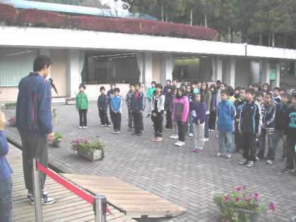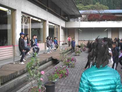 最終日の朝です。運動委員が前に出て喜多見体操をしました。(10月28日6時)