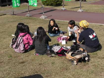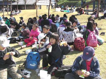 移動教室最後の昼食です。穏やかな陽気だったので、芝生の上で班ごとに食べました。(10月28日12時)