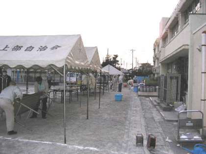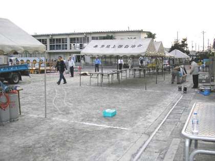 地域の方が、校庭にテントややぐらを組み立てています。(11月2日)