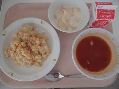 デザートは、缶づめのみかん、桃、りんごにたっぷりヨーグルトをかけた「フルーツヨーグルト」です。満腹でも食べられるさっぱり感のあるデザートです。