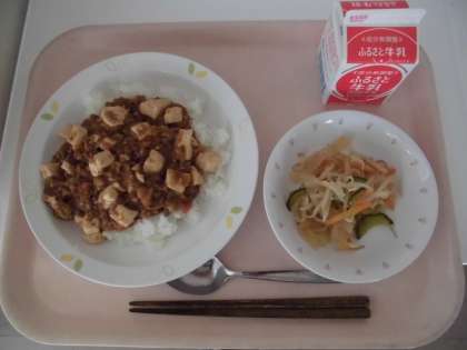 マーボー丼は、低学年と高学年で味付けを変えています。低学年は辛味をおさえたみそのコクを感じる味、高学年はピリリと辛味を感じる味です。全校のみんながおいしく食べられるように工夫しています。