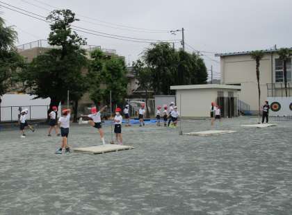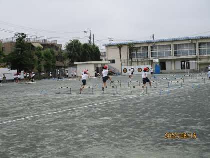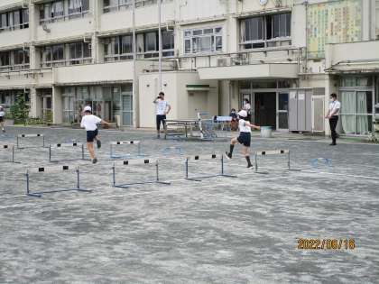 喜多見中学校の北村先生が見守る中、ハードル走と走高跳をしました。