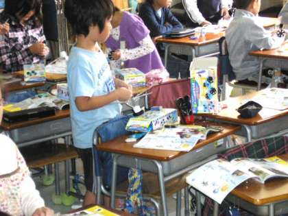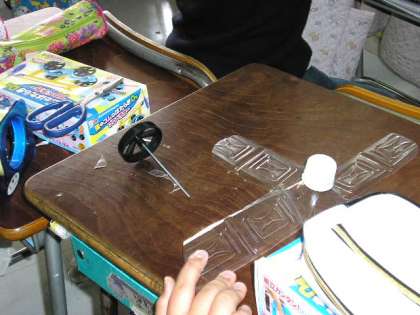 風の力を調べるために、ペットボトルを利用して風車を作りました。(11月14日)