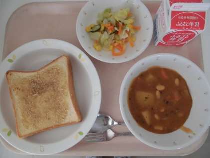 今日のトーストは、バターとすりごまとはちみつを混ぜたものを塗って焼いた「ごまハニートースト」です。6月号の給食だよりにレシピを載せたので、自宅で作った人もいたようで「おいしいやつだ!」と話していました!