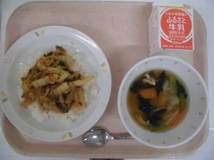 キムチ丼は、低学年用と高学年用の2段階の辛さにしています。どちらも辛味だけでなく、うま味やコクを感じる味付けです。