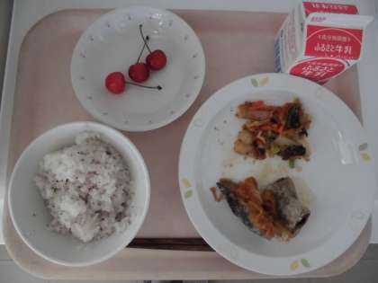 デザートは、さくらんぼです!さくらんぼは旬の時期が短いので、給食でもなかなか出すことができません。真っ赤に熟した実は、とても甘かったですね。