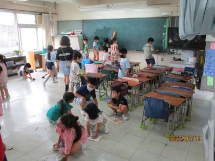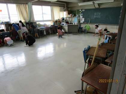 ほうきやぞうきん、メラミンスポンジ、粉末の研磨剤も使用して、1学期の汚れを落としていました。