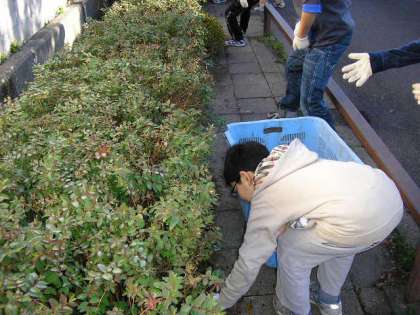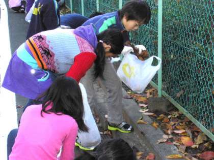 5年生は、校舎のまわりに落ちている落ち葉を集めました。(12月5日)