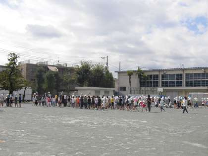 教室から避難した児童は、防災ずきんをかぶり、グラウンドへ移動しました。