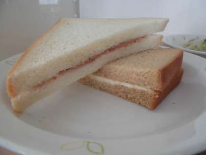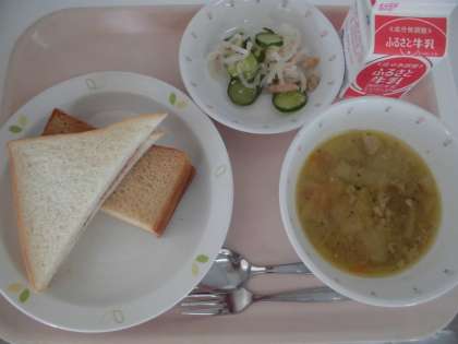 今日の主食は、サンドイッチです。黒砂糖食パンにはクリームチーズを、白い食パンにはいちごジャムを、それぞれはさんでいます。合わせて食べてもおいしいですね!