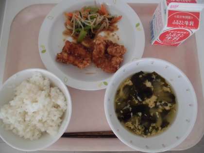 中華風の献立です。ユーリンチーは鶏肉をカラッと揚げてから、しょうゆベースのたれをかけています。しょうがやねぎがきいて、ごはんがすすむ味でした。