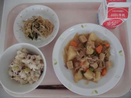 今の時期にさく「はぎ」の花をイメージしたごはんです。下ゆでしたあずきとえだまめをごはんに入れて炊きました。見て美しく、食べておいしい秋ですね!