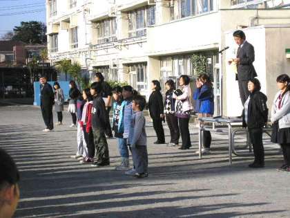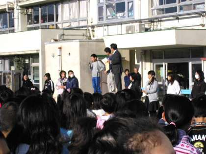 6年生の挨拶の後校長先生の話がありました。今日は、野球で活躍した6年生の紹介がありました。(12月12日)