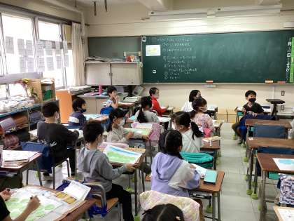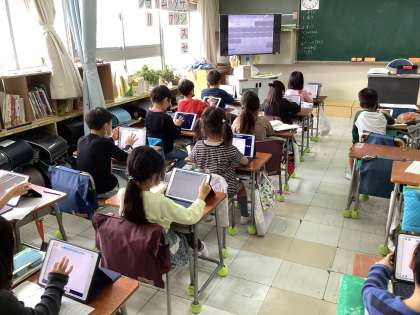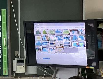 形で作品作りをしたクラスでは、丸や四角に切った紙を貼り、色を塗ったのをタブレットで写真を撮り、先生に提出しました。ブドウやクジラ、観覧車など思い思いの作品ができました。