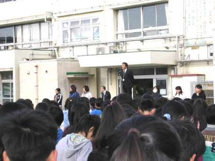 今学期最後の児童朝会が行われました。寒さが増してきましたが、みんなしっかりと聞いていました。(12月19日)