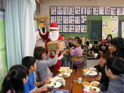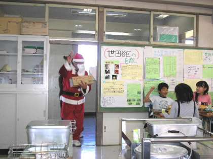 サンタが喜多見小にやってきた! 公開日 2011/12/19 更新日 2011/12/19 その他の教育活動 毎年、2学期最後の給食にはサンタさん?が各クラスにデザートを届けてくれます。今年は雪見だいふくでした。(12月19日)