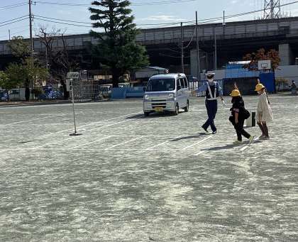 その後、手を上げて、横断歩道を渡る練習をしました。